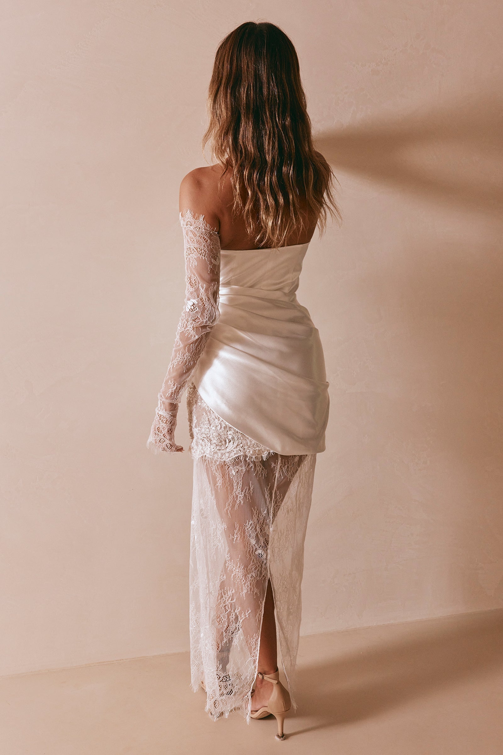 Transform and personalise your look by pairing this short wedding dress with our wedding skirts, providing several looks in one. Sateen is a versatile mini, wearable beyond the wedding day.