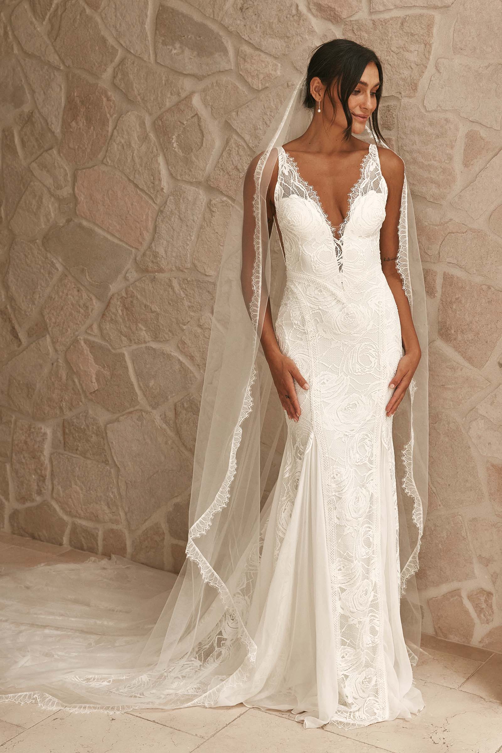 A vision of effortless beauty in motion, we introduce Dahlia. This lace wedding dress features delicate rose detailing and a feminine V-neckline, designed for those magical wedding day moments.