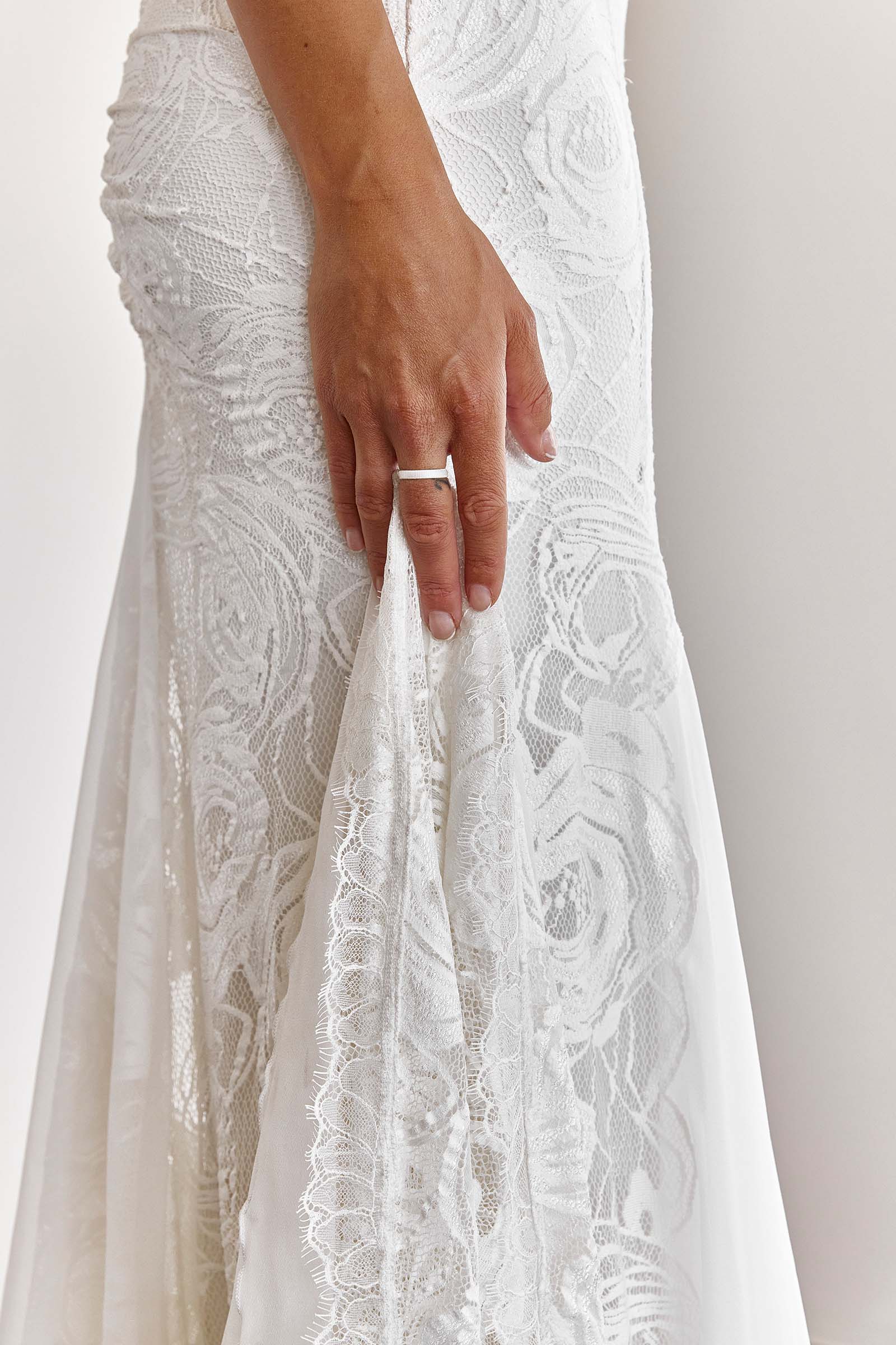 • Silk chiffon skirt godets and train create a dimensional layer over the lace