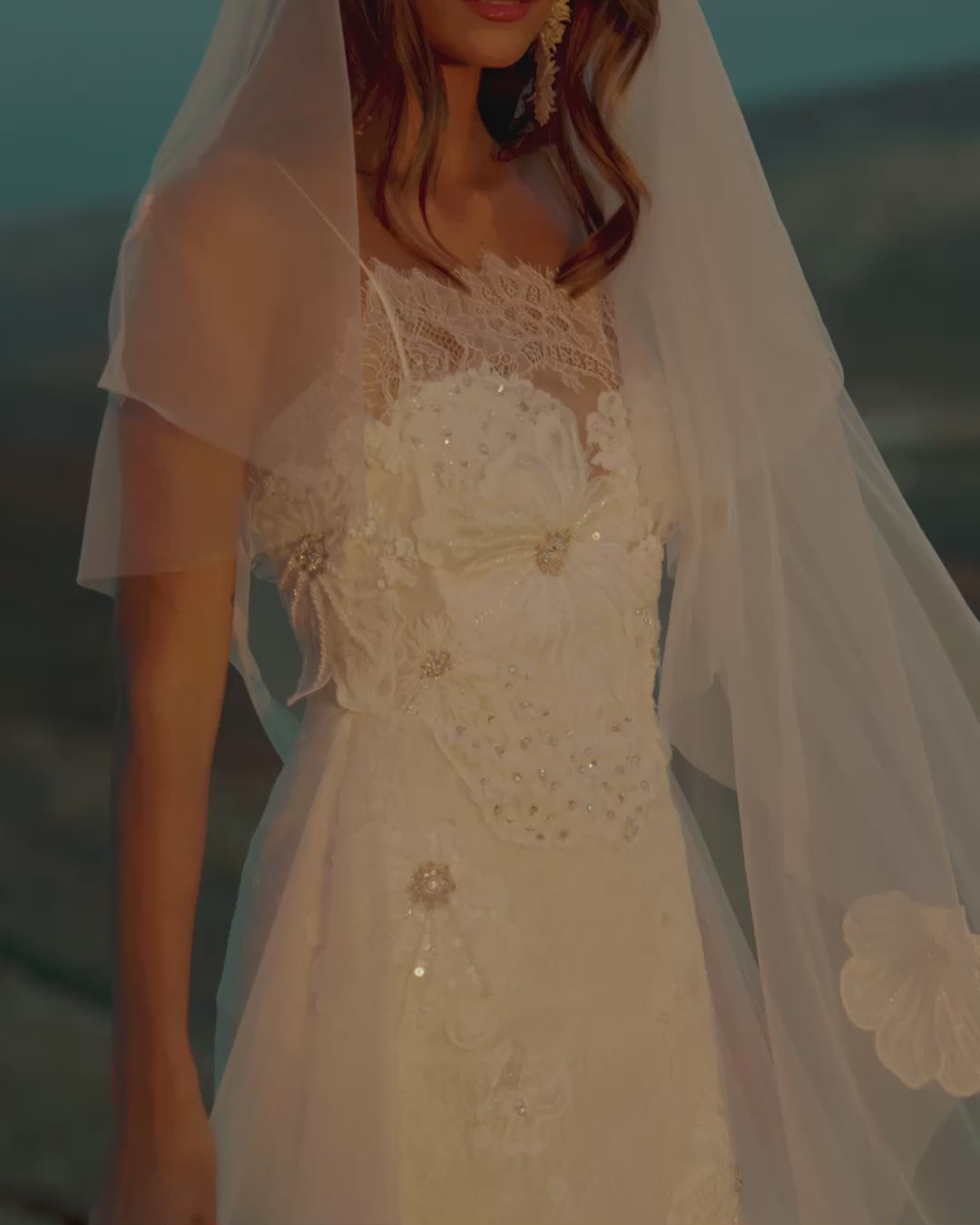 Drawing inspiration from 1920s glamour, this lace wedding dress features a sheer design layered with delicate lace and adorned with hand-placed floral embroidery that cascades down the train. Rosie offers both beauty and structureyou'd never know it has built-in shapewear and boning, providing subtle support without sacrificing its light, effortless feel.