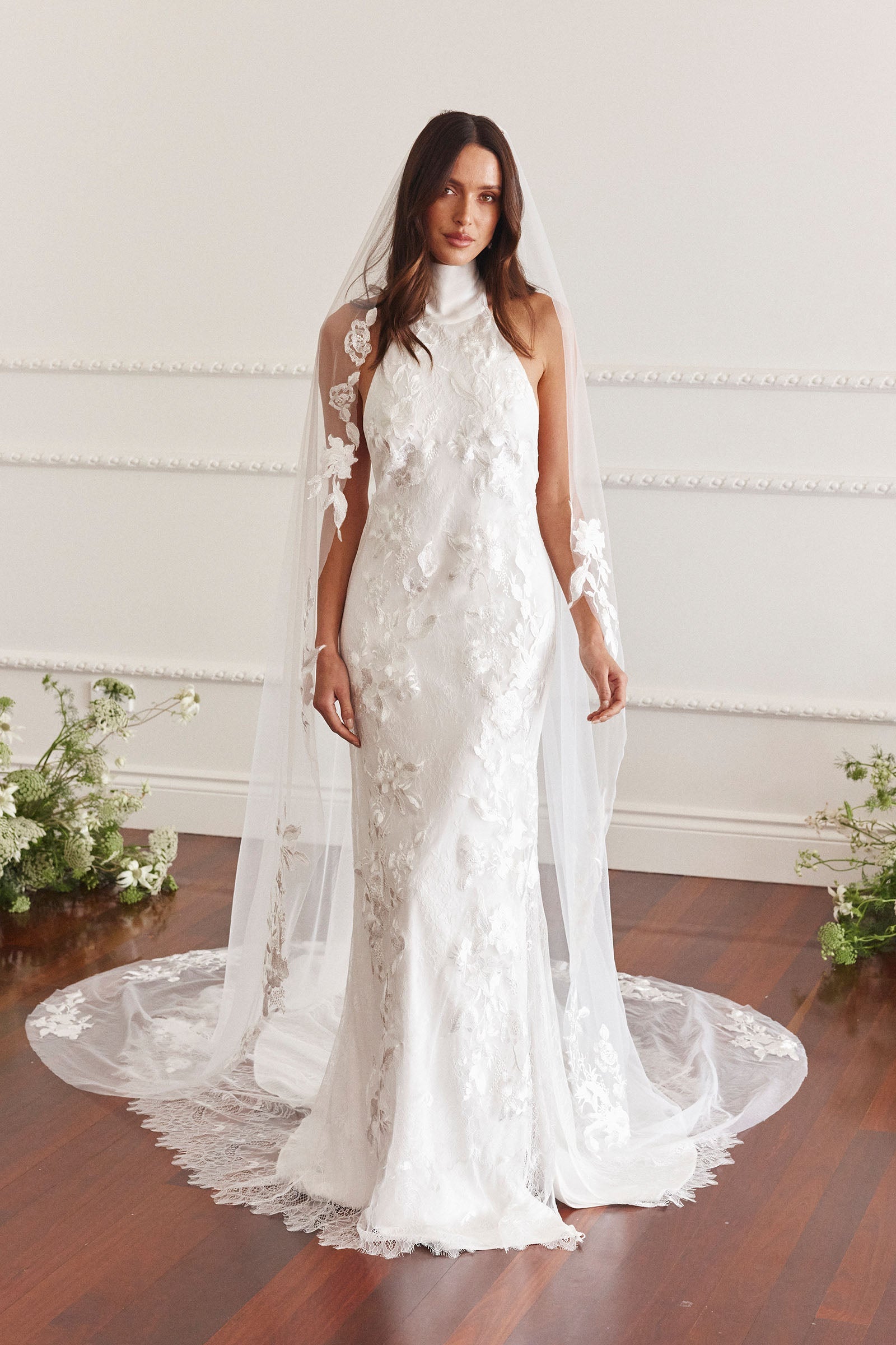 Stevie is as authentic as the love she celebrates. This poetic creation marries Chantilly lace with intricate hand-appliqued embroidery, culminating in a confident high neckline that celebrates character and creativity.