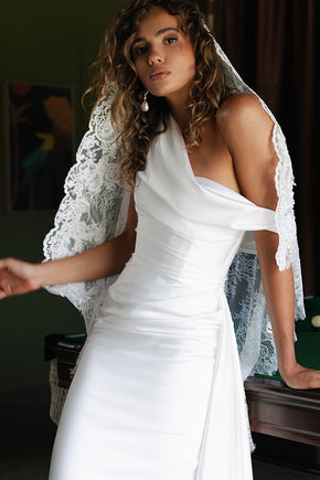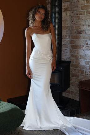 Clo-crepe speaks a softer language. The crepe wedding dress features centre-back ruching paired with a mermaid silhouette that defines pared-back drama. Clo Crepe is pure luxury with decadent stretch crepe for the modern bride.