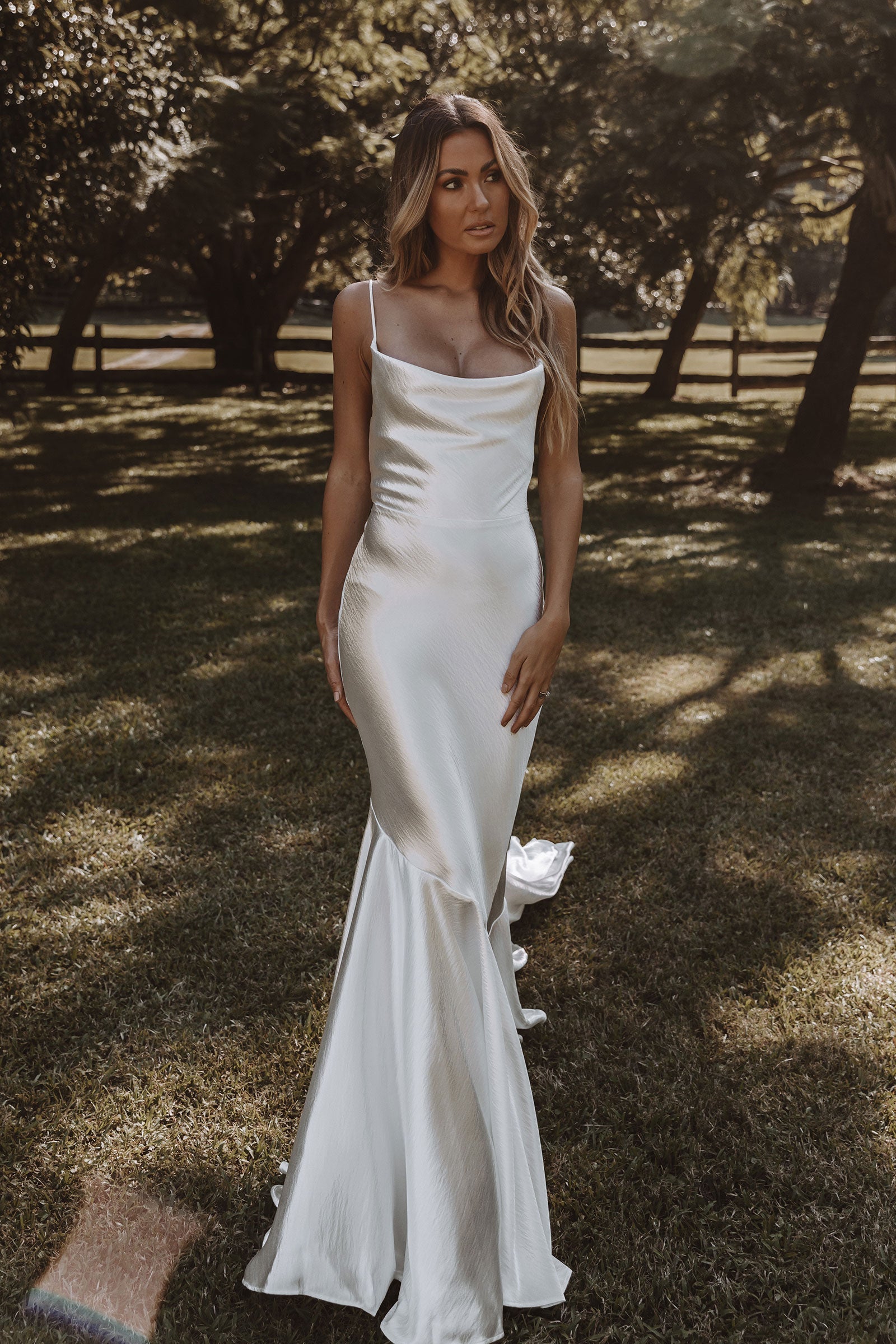 Fall in love with Aura. This cowl-neck wedding dress, crafted from highly-visual textured satin, is made for the dance floor. With a fit and flare silhouette and an open back, Aura is a fashion-forward design.