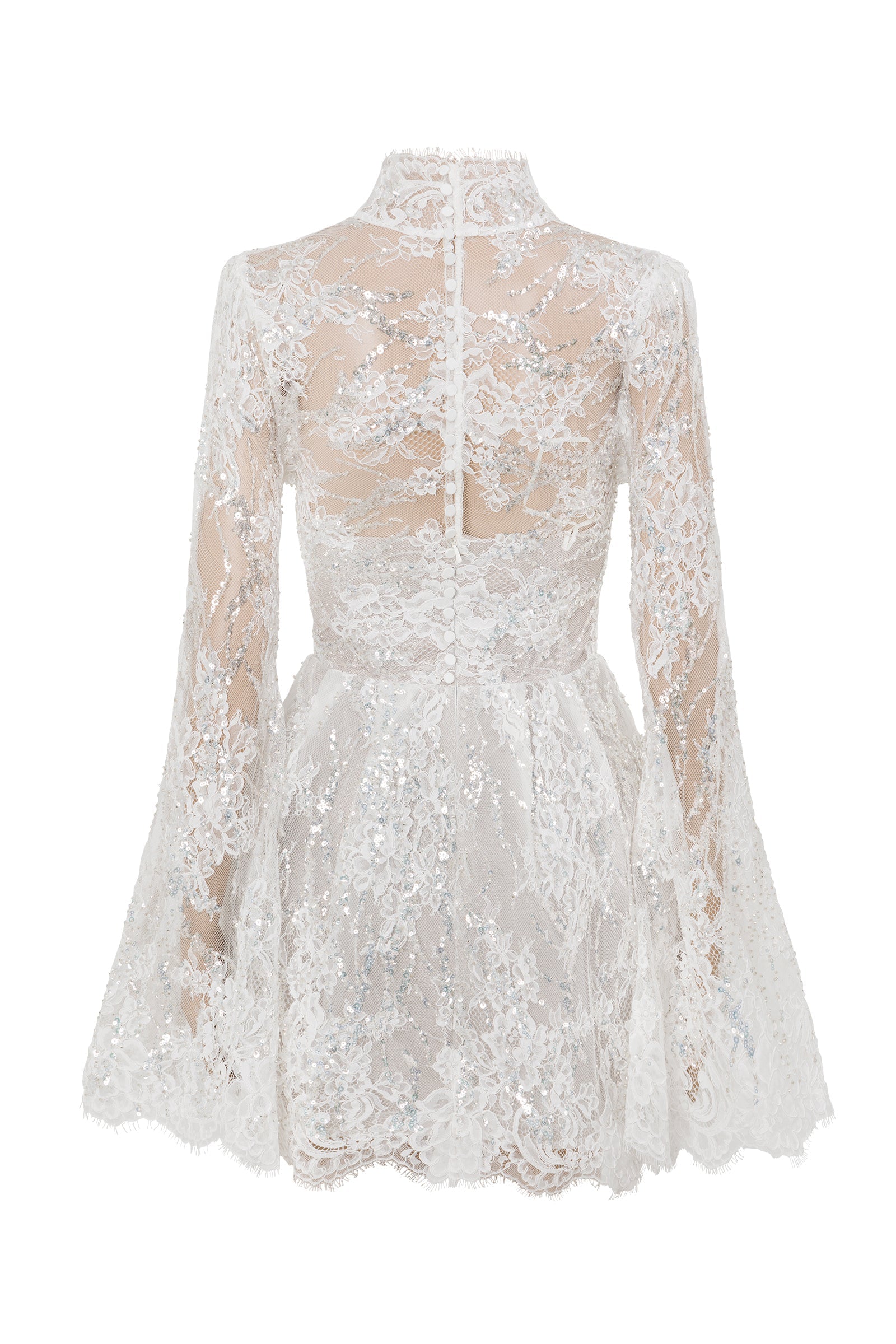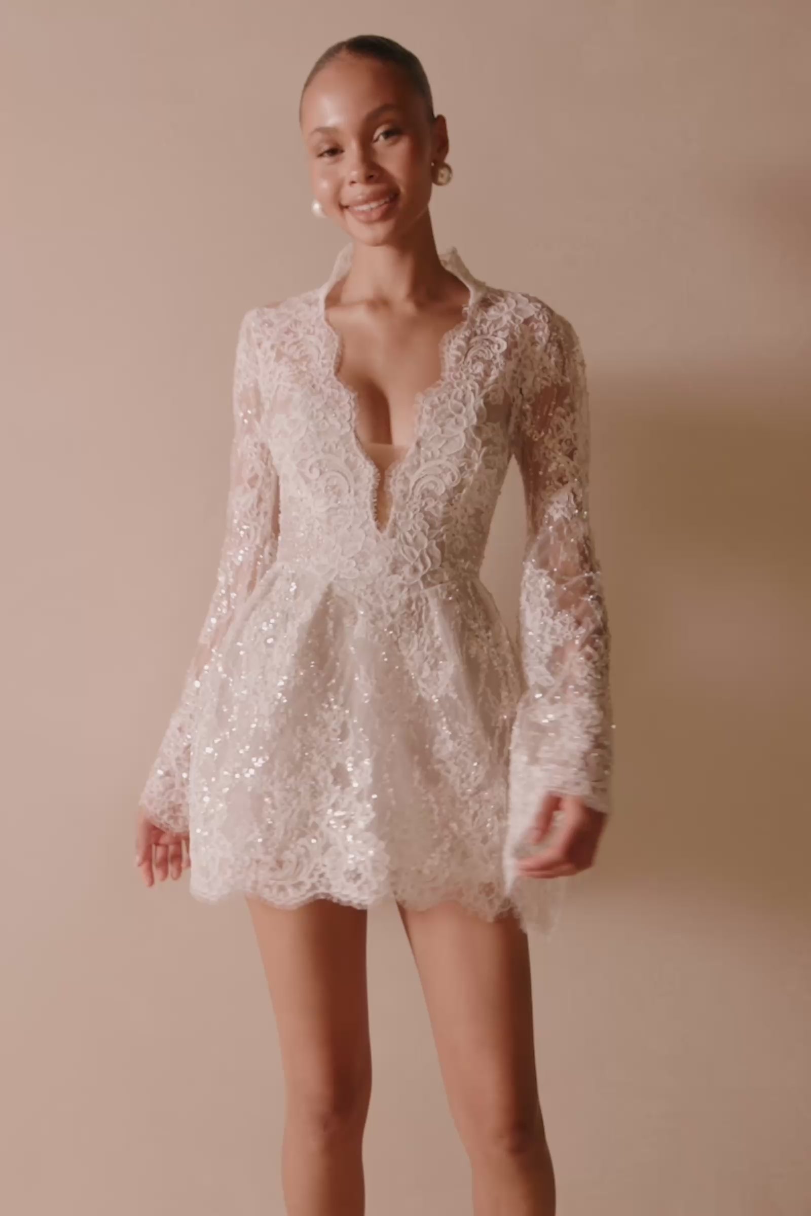 A short wedding dress that does the talking, Camille is art. With exclusive rigid corded lace, this long-sleeved mini dress adds attitude with a low v-neckline—designed to switch up your look with our long Chantilly skirt.