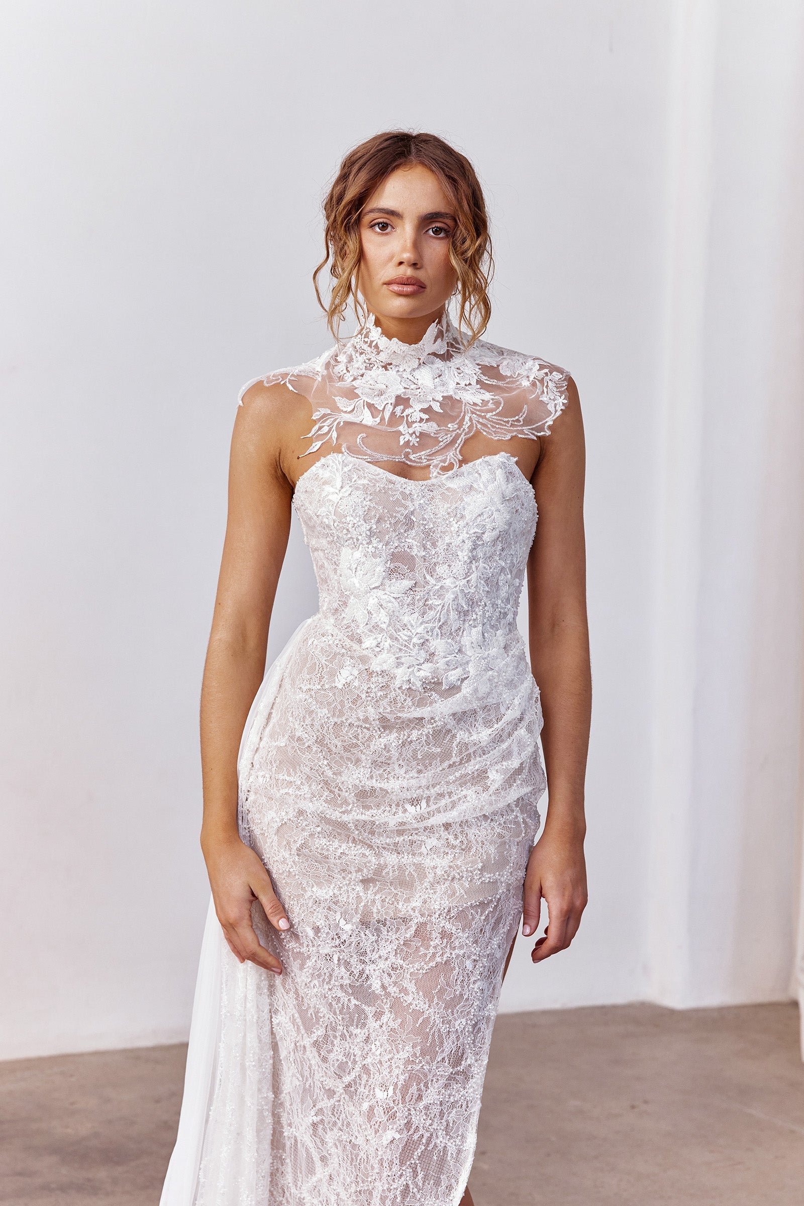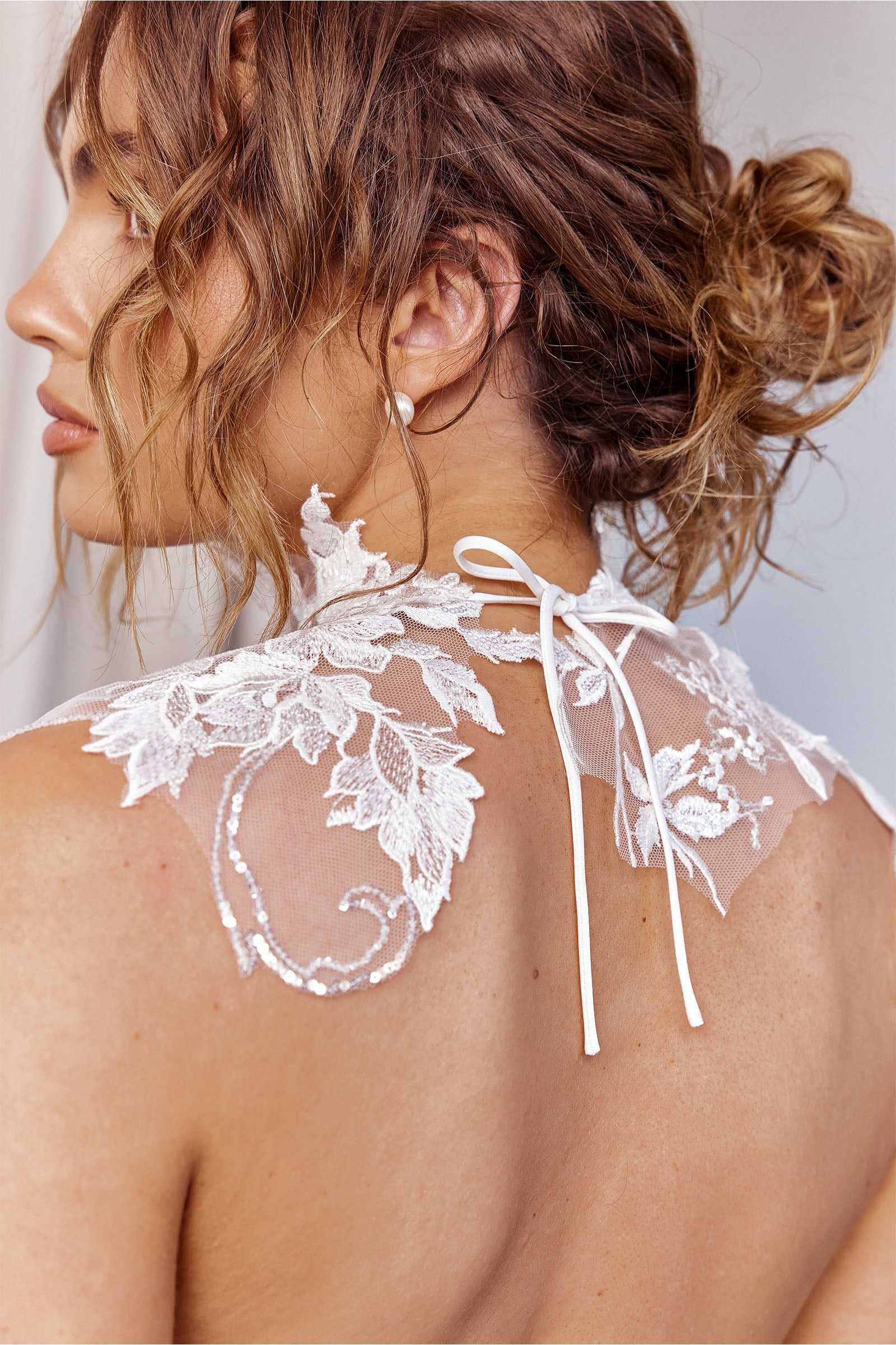 A statement bridal accessory that simplifies styling. The Cartier Neckpiece is made for celebrating, featuring bold beaded floral embroidery that adds captivating texture and dimension to any bridal look.