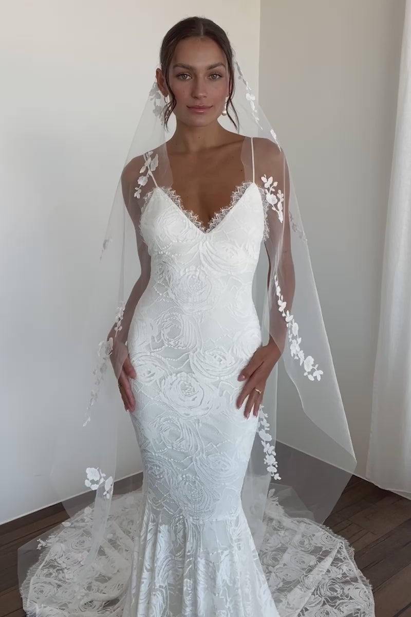 Indulge in the romantic embrace of Clo. Elegant rose stretch lace adorns the body, rendering a dress that will never date. With an ethereal fit and flare silhouette, this lace wedding dress is a vision of femininity.