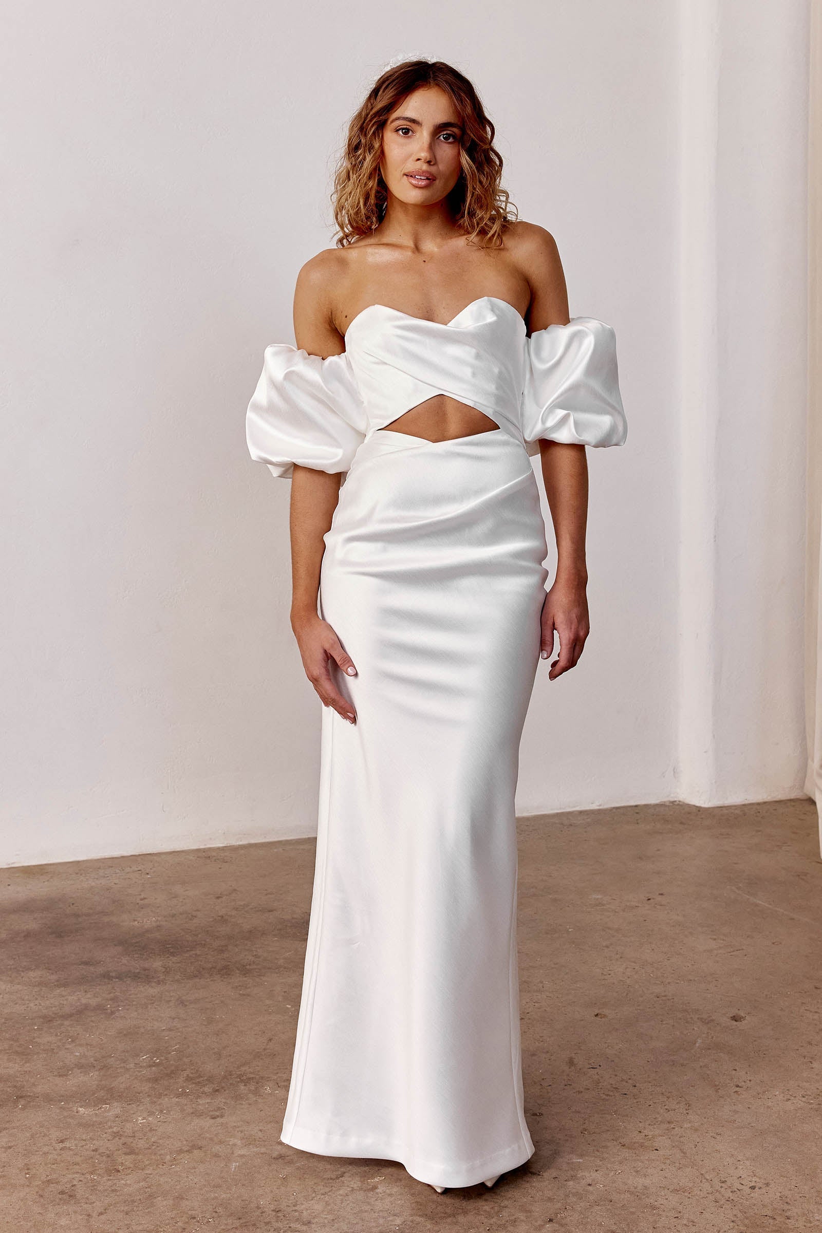 Crafted from dupion satin with flexi-boning, the internal construction is made to skim and flatter the body, offering a structured column fit. Finished with a front-cut out and elasticated puff sleeves, Emory is confident and considered.