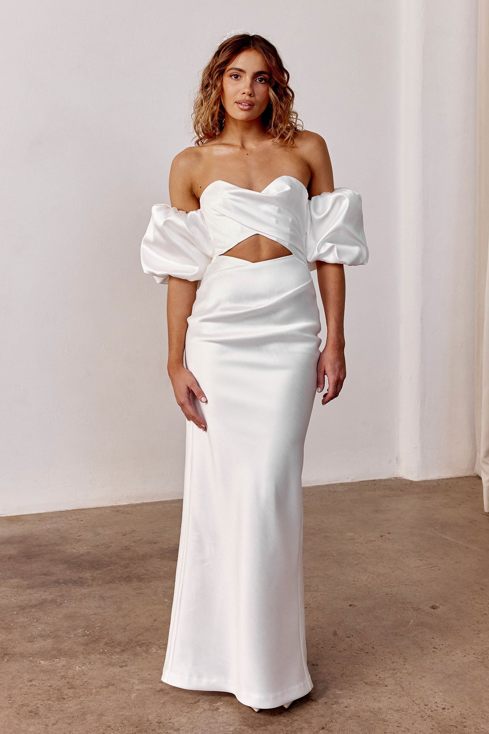 All eyes on Emory, a modern take on the puff-sleeve. Made for rehearsal dinners, wedding receptions and every event in between, she's a casual wedding dress that still makes a statement.