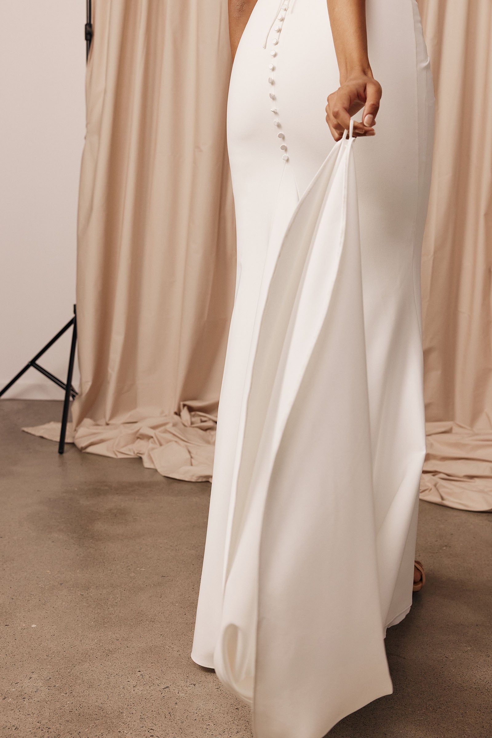 Introducing your bridal canvas. James is the foundation of modern structure, crafted from a new bright off-white stretch crepe that sculpts and supports in equal measure.