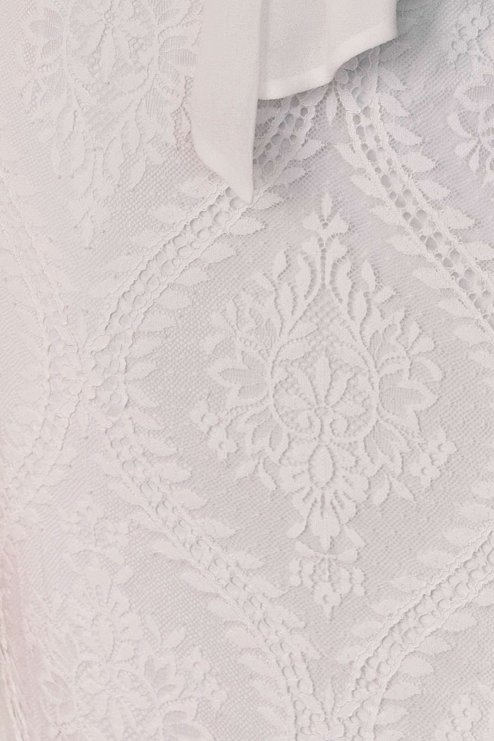 With sheer long sleeves, a bow detail at the bodice and an open back, she's a statement in lace, made for celebrating. The perfect plus one for your bridal wardrobe, from rehearsal dinner to second look and everything in between.