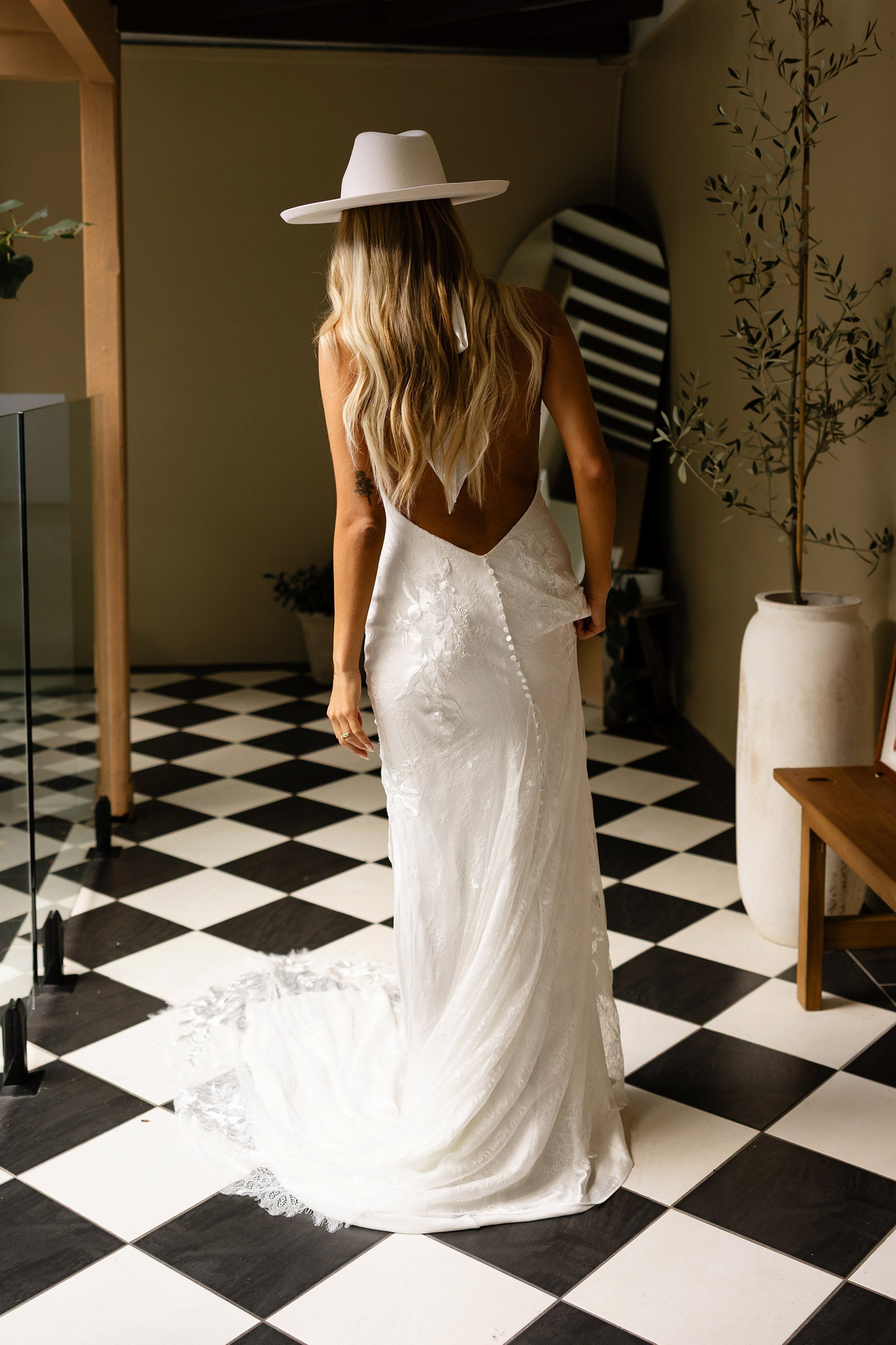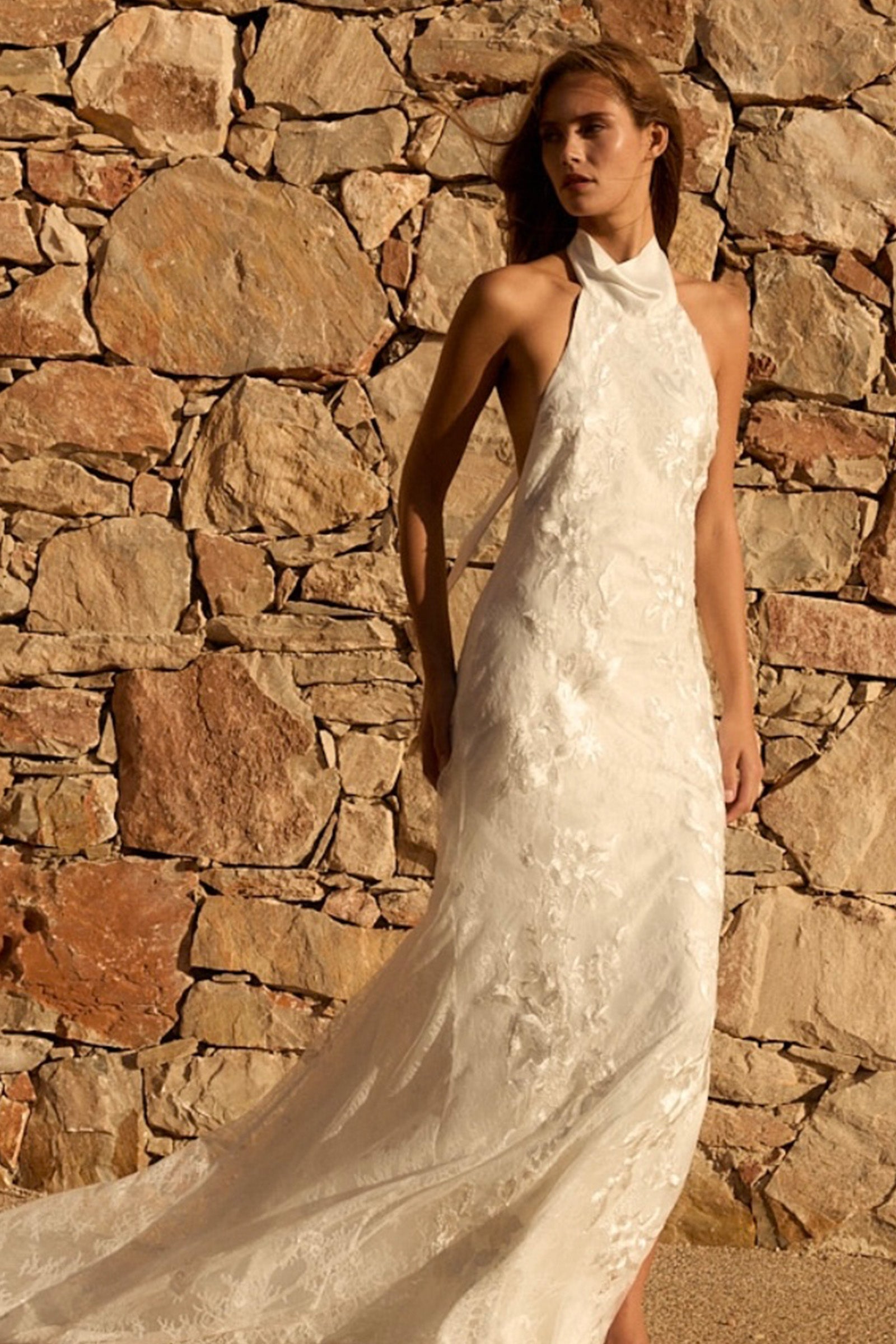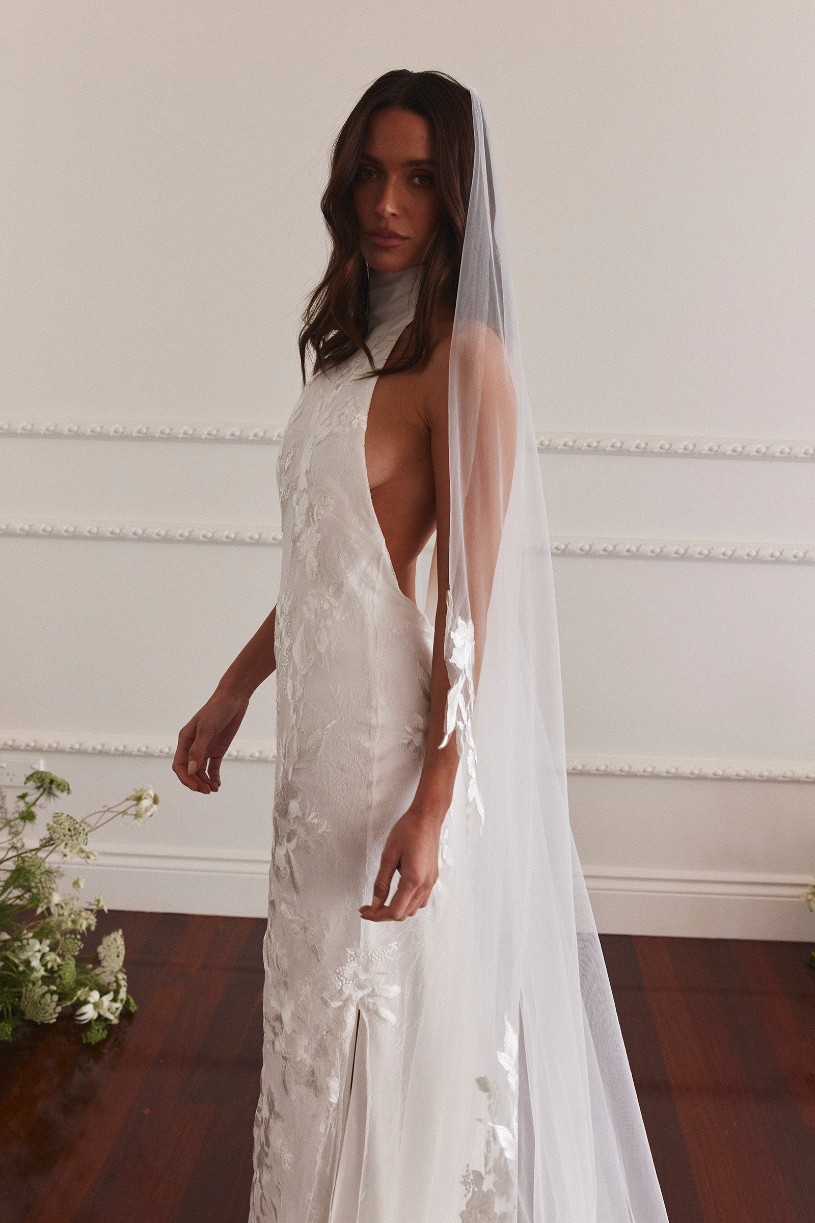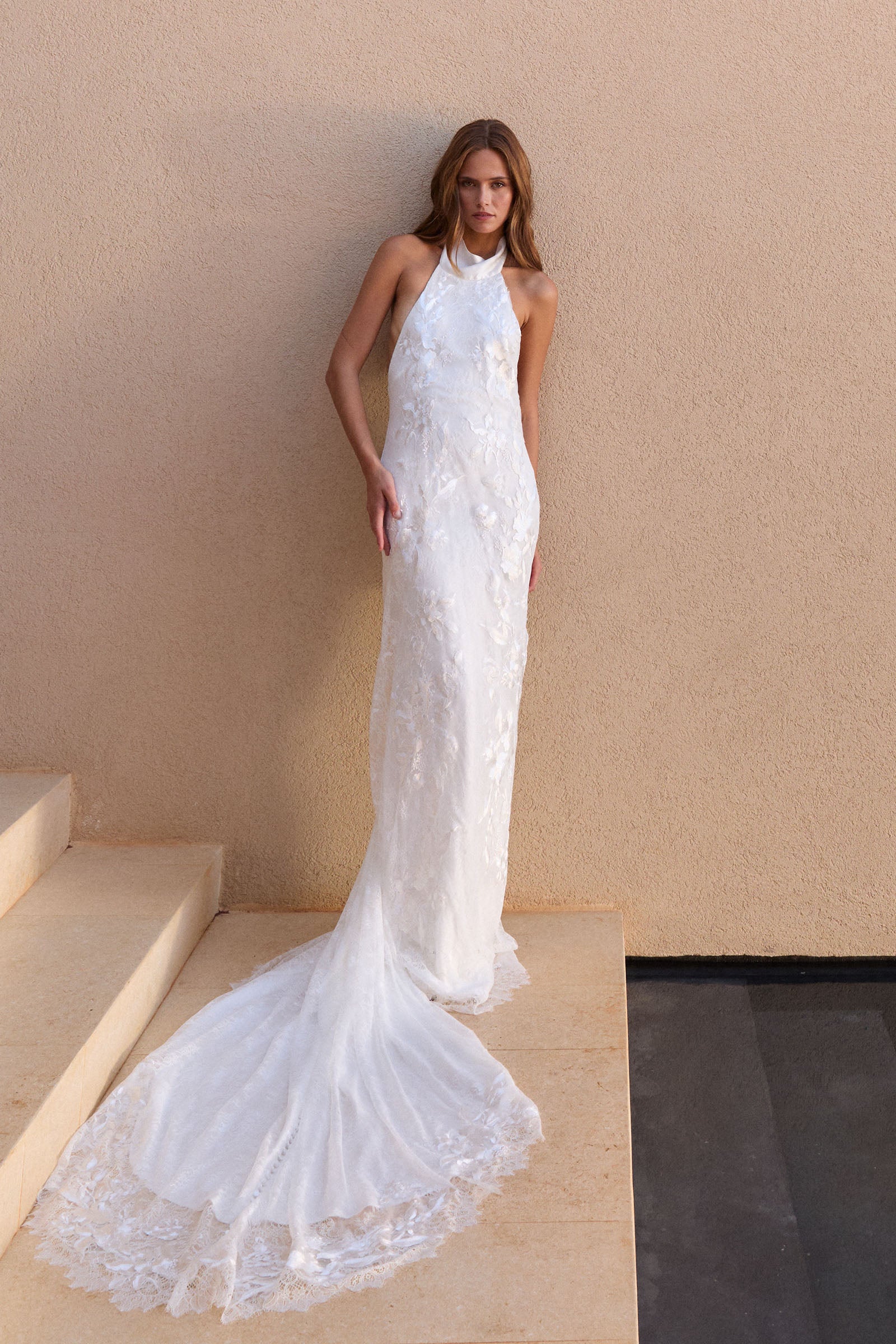 Stevie is as authentic as the love she celebrates. This poetic creation marries Chantilly lace with intricate hand-appliqued embroidery, culminating in a confident high neckline that celebrates character and creativity.