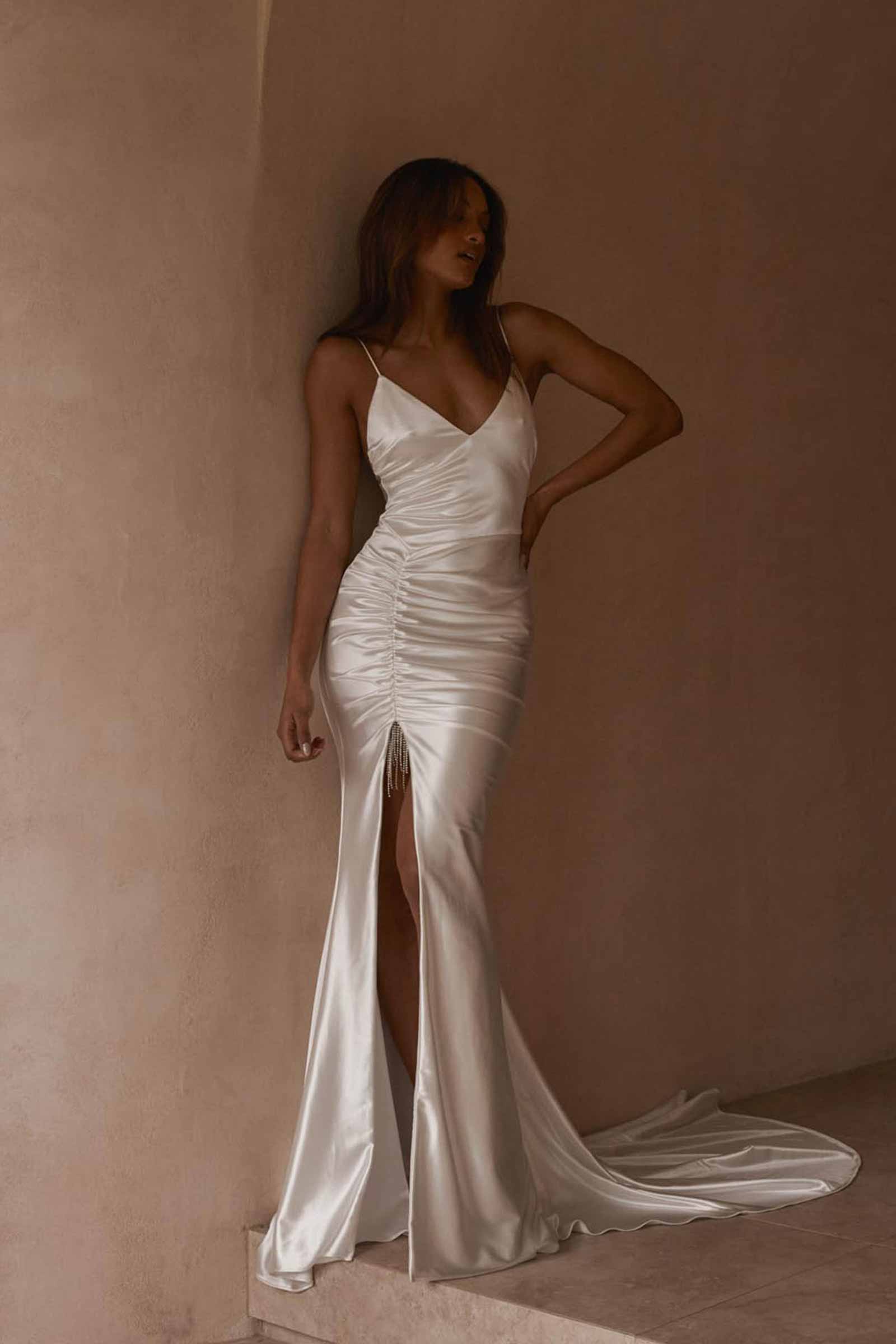 Feminine touches present through detailed rouching, and a daring thigh-high split. This backless wedding dress is pure luxury.
