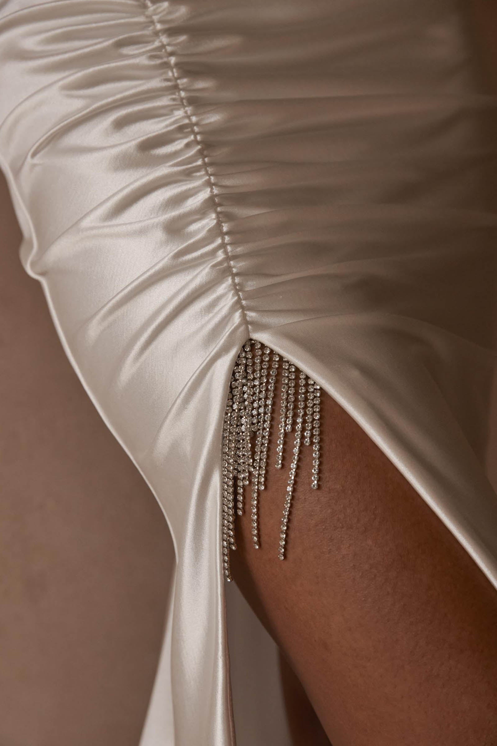 • Gown features detachable diamante fringe trim at skirt and draped backpiece